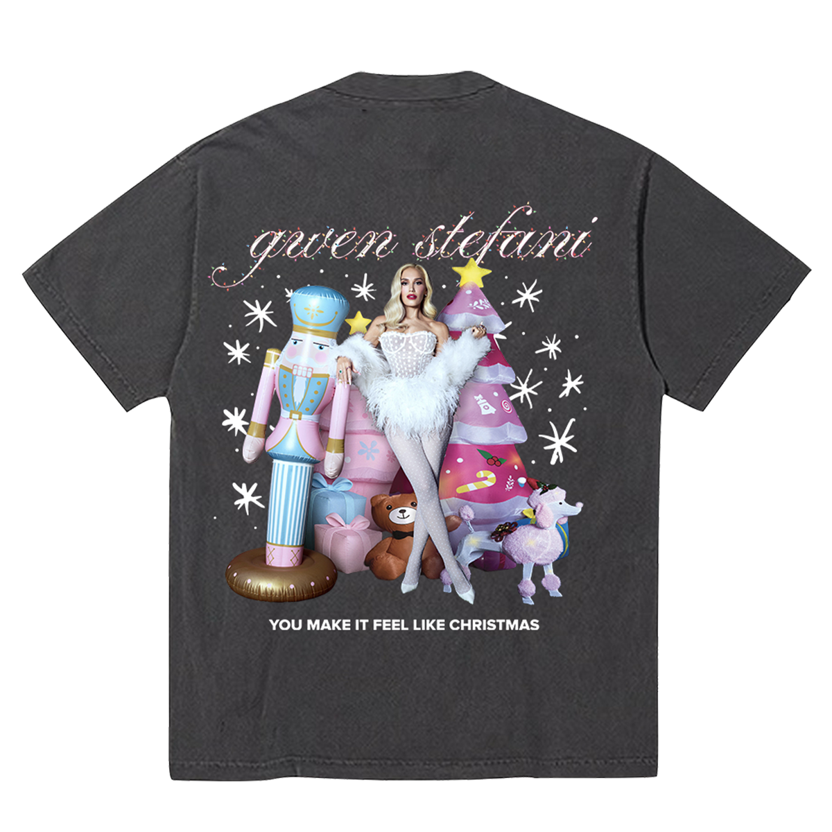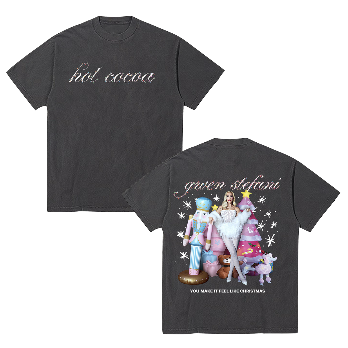 Unisex, gray tee featuring hot cocoa string light text on front and Gwen Stefani art on back.